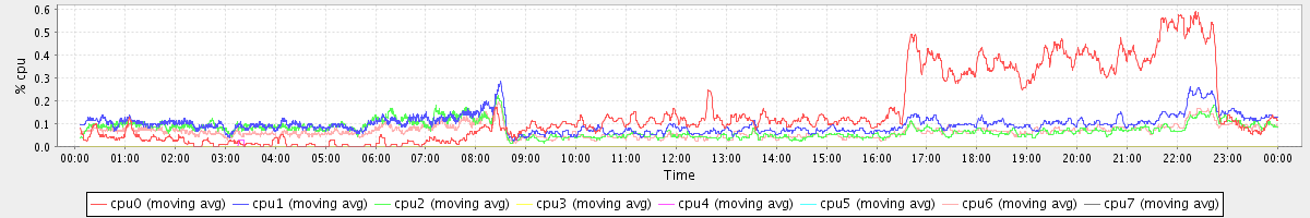avg(cpu0) = 1.49 avg(cpu1) = 0.36 avg(cpu2) = 0.30 avg(cpu3) = 0.17 avg(cpu4) = 0.13 avg(cpu5) = 0.14 avg(cpu6) = 0.26 avg(cpu7) = 0.13