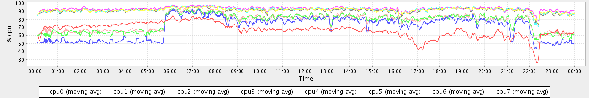 avg(cpu0) = 66.53 avg(cpu1) = 70.32 avg(cpu2) = 76.76 avg(cpu3) = 91.49 avg(cpu4) = 92.97 avg(cpu5) = 91.89 avg(cpu6) = 77.15 avg(cpu7) = 91.12