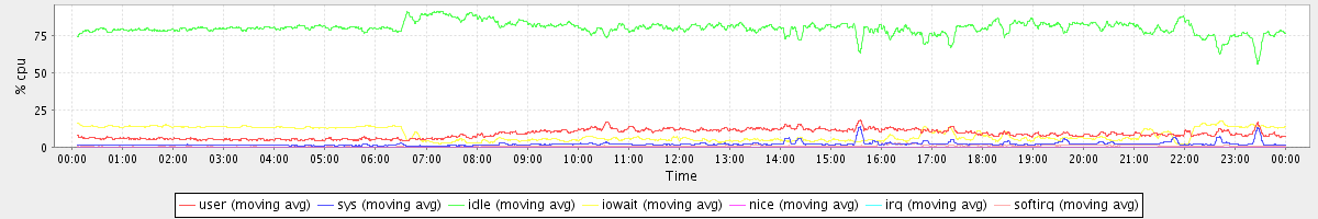 avg(user) = 8.79 avg(sys) = 1.99 avg(idle) = 80.08 avg(iowait) = 8.44 avg(nice) = 0.00 avg(irq) = 0.03 avg(softirq) = 0.66