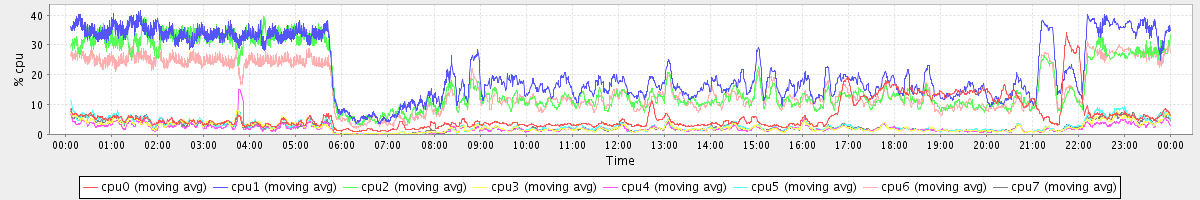 avg(cpu0) = 6.23 avg(cpu1) = 21.55 avg(cpu2) = 17.67 avg(cpu3) = 2.39 avg(cpu4) = 2.05 avg(cpu5) = 2.74 avg(cpu6) = 15.62 avg(cpu7) = 2.50