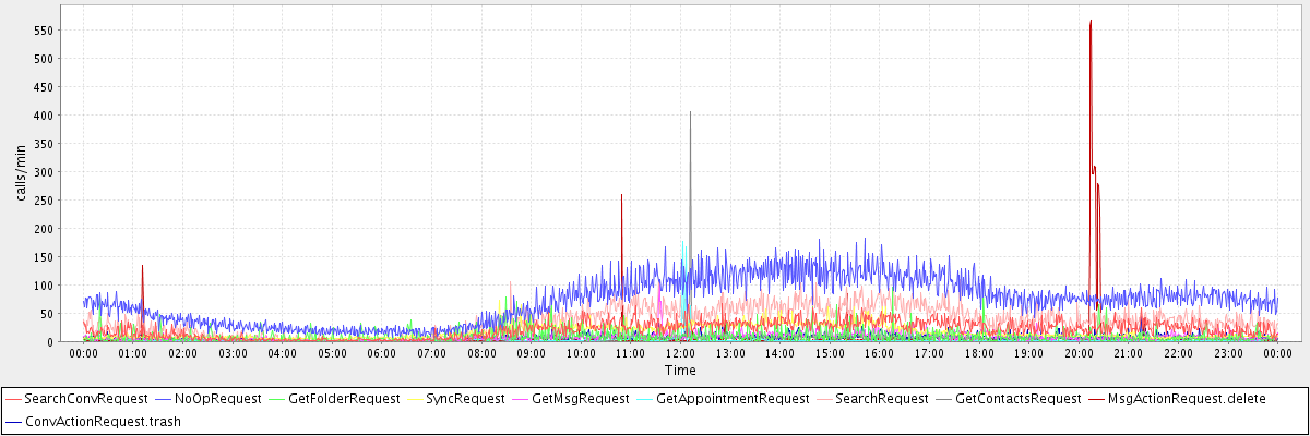 max(SearchConvRequest) = 67.00 max(NoOpRequest) = 182.00 max(GetFolderRequest) = 95.00 max(SyncRequest) = 73.00 max(GetMsgRequest) = 101.00 max(GetAppointmentRequest) = 177.00 max(SearchRequest) = 110.00 max(GetContactsRequest) = 406.00 max(MsgActionRequest.delete) = 567.00 max(ConvActionRequest.trash) = 44.00
