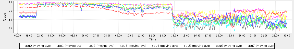 avg(cpu0) = 3.70 avg(cpu1) = 10.43 avg(cpu2) = 9.07 avg(cpu3) = 0.71 avg(cpu4) = 1.26 avg(cpu5) = 0.95 avg(cpu6) = 7.16 avg(cpu7) = 0.58