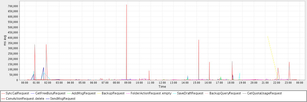 avg(SyncGalRequest) = 3866.51 avg(GetFreeBusyRequest) = 570.73 avg(AddMsgRequest) = 402.53 avg(BackupRequest) = 210526.50 avg(FolderActionRequest.empty) = 1733.44 avg(SaveDraftRequest) = 601.33 avg(BackupQueryRequest) = 860.20 avg(GetQuotaUsageRequest) = 2675.00 avg(ConvActionRequest.delete) = 490.37 avg(SendMsgRequest) = 611.35
