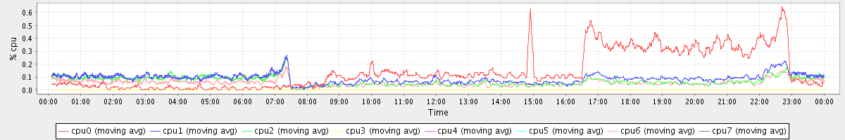 avg(cpu0) = 1.38 avg(cpu1) = 0.30 avg(cpu2) = 0.28 avg(cpu3) = 0.13 avg(cpu4) = 0.10 avg(cpu5) = 0.12 avg(cpu6) = 0.23 avg(cpu7) = 0.12