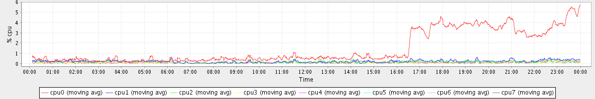avg(cpu0) = 1.46 avg(cpu1) = 0.20 avg(cpu2) = 0.18 avg(cpu3) = 0.06 avg(cpu4) = 0.08 avg(cpu5) = 0.06 avg(cpu6) = 0.14 avg(cpu7) = 0.06