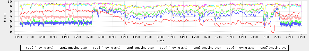 avg(cpu0) = 66.85 avg(cpu1) = 67.85 avg(cpu2) = 72.17 avg(cpu3) = 91.78 avg(cpu4) = 92.40 avg(cpu5) = 91.81 avg(cpu6) = 76.49 avg(cpu7) = 92.39