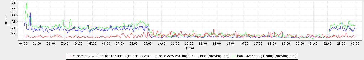 avg(processes waiting for run time) = 1.10 avg(processes waiting for io time) = 2.48 avg(load average (1 min)) = 3.73