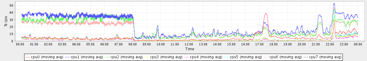 avg(cpu0) = 4.53 avg(cpu1) = 21.37 avg(cpu2) = 17.47 avg(cpu3) = 2.11 avg(cpu4) = 1.72 avg(cpu5) = 2.38 avg(cpu6) = 15.45 avg(cpu7) = 2.44