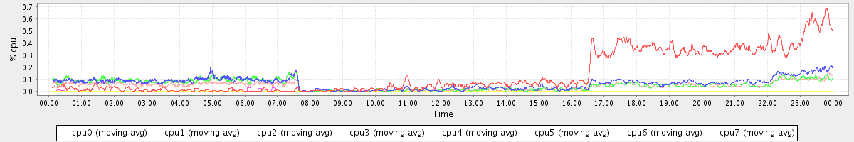 avg(cpu0) = 1.34 avg(cpu1) = 0.20 avg(cpu2) = 0.18 avg(cpu3) = 0.06 avg(cpu4) = 0.05 avg(cpu5) = 0.05 avg(cpu6) = 0.14 avg(cpu7) = 0.06