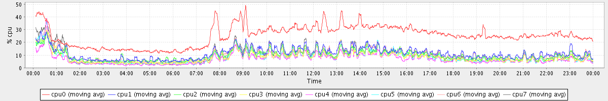 avg(cpu0) = 25.17 avg(cpu1) = 11.36 avg(cpu2) = 9.88 avg(cpu3) = 8.56 avg(cpu4) = 7.06 avg(cpu5) = 8.33 avg(cpu6) = 10.24 avg(cpu7) = 9.72