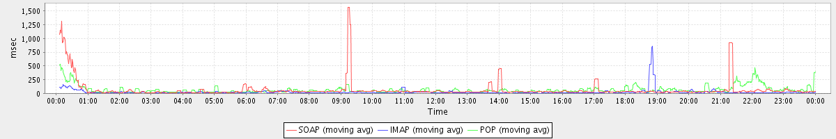 avg(ImportAppointmentsRequest) = 8619.00 avg(BackupRequest) = 345375.00 avg(FolderActionRequest.empty) = 1740.44 avg(SaveDraftRequest) = 274.31 avg(BackupQueryRequest) = 965.20 avg(ConvActionRequest.flag) = 221.46 avg(CreateAppointmentExceptionRequest) = 238.00 avg(GetQuotaUsageRequest) = 2633.00 avg(ConvActionRequest.delete) = 763.71 avg(SendMsgRequest) = 382.56