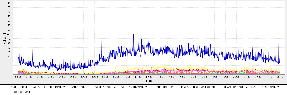 max(GetMsgRequest) = 60.00 max(GetAppointmentRequest) = 41.00 max(AuthRequest) = 29.00 max(SearchRequest) = 152.00 max(SearchConvRequest) = 91.00 max(GetInfoRequest) = 51.00 max(MsgActionRequest.delete) = 31.00 max(ConvActionRequest.trash) = 44.00 max(NoOpRequest) = 65.00 max(GetFolderRequest) = 783.00