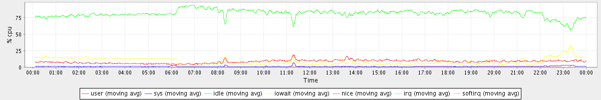 avg(user) = 8.39 avg(sys) = 1.17 avg(idle) = 81.32 avg(iowait) = 8.76 avg(nice) = 0.00 avg(irq) = 0.04 avg(softirq) = 0.32