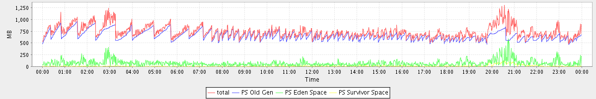 avg(total) = 733.81 avg(PS Old Gen) = 654.50 avg(PS Eden Space) = 68.57 avg(PS Survivor Space) = 10.74