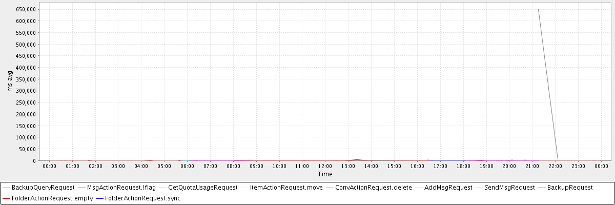 avg(BackupQueryRequest) = 288.60 avg(MsgActionRequest.!flag) = 114.44 avg(GetQuotaUsageRequest) = 2750.00 avg(ItemActionRequest.move) = 114.00 avg(ConvActionRequest.delete) = 140.74 avg(AddMsgRequest) = 260.53 avg(SendMsgRequest) = 268.96 avg(BackupRequest) = 327010.50 avg(FolderActionRequest.empty) = 568.14 avg(FolderActionRequest.sync) = 2449.00