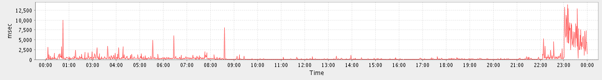 avg(CreateAppointmentRequest) = 1594.05 avg(GetFreeBusyRequest) = 6242.00 avg(GetMiniCalRequest) = 1351.98 avg(MaintainTablesRequest) = 386642.00 avg(GetQuotaUsageRequest) = 2690.00 avg(ConvActionRequest.delete) = 2030.18 avg(AddMsgRequest) = 884.29 avg(SendMsgRequest) = 913.63 avg(BackupRequest) = 478283.00 avg(FolderActionRequest.empty) = 33756.55
