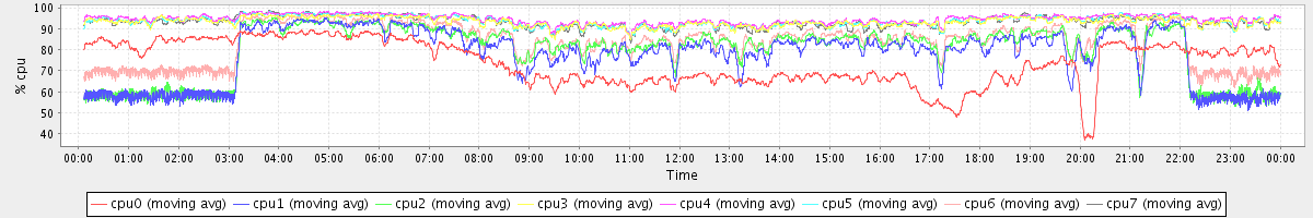 avg(cpu0) = 73.99 avg(cpu1) = 77.98 avg(cpu2) = 80.09 avg(cpu3) = 93.32 avg(cpu4) = 94.60 avg(cpu5) = 93.77 avg(cpu6) = 83.63 avg(cpu7) = 93.45