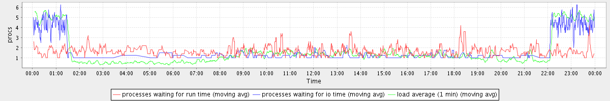 avg(processes waiting for run time) = 0.68 avg(processes waiting for io time) = 0.84 avg(load average (1 min)) = 1.61