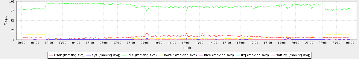 avg(user) = 6.74 avg(sys) = 1.08 avg(idle) = 87.43 avg(iowait) = 4.49 avg(nice) = 0.00 avg(irq) = 0.01 avg(softirq) = 0.23