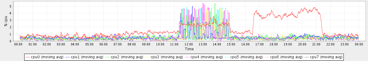 avg(cpu0) = 5.77 avg(cpu1) = 22.20 avg(cpu2) = 19.36 avg(cpu3) = 1.88 avg(cpu4) = 1.91 avg(cpu5) = 2.37 avg(cpu6) = 15.60 avg(cpu7) = 2.25