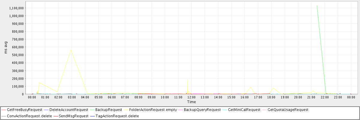 avg(GetFreeBusyRequest) = 1407.87 avg(DeleteAccountRequest) = 9039.00 avg(BackupRequest) = 568969.00 avg(FolderActionRequest.empty) = 38351.11 avg(BackupQueryRequest) = 1185.60 avg(GetMiniCalRequest) = 797.63 avg(GetQuotaUsageRequest) = 2703.00 avg(ConvActionRequest.delete) = 1257.07 avg(SendMsgRequest) = 367.42 avg(TagActionRequest.delete) = 3987.00