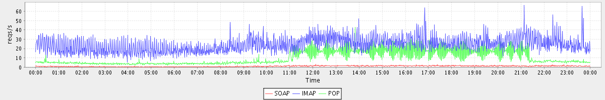 Host zm08.stanford.edu: Mailboxd: Request Rate by Client Protocol