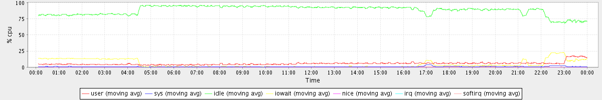 avg(user) = 5.60 avg(sys) = 0.78 avg(idle) = 88.43 avg(iowait) = 4.94 avg(nice) = 0.00 avg(irq) = 0.03 avg(softirq) = 0.23