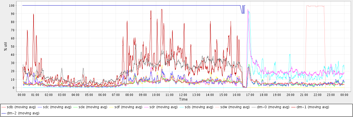 avg(sdb) = 5.32 avg(sdc) = 5.86 avg(sde) = 5.07 avg(sdf) = 4.38 avg(sdr) = 10.75 avg(sds) = 5.79 avg(sdw) = 6.38 avg(dm-0) = 15.37 avg(dm-1) = 24.15 avg(dm-2) = 99.95