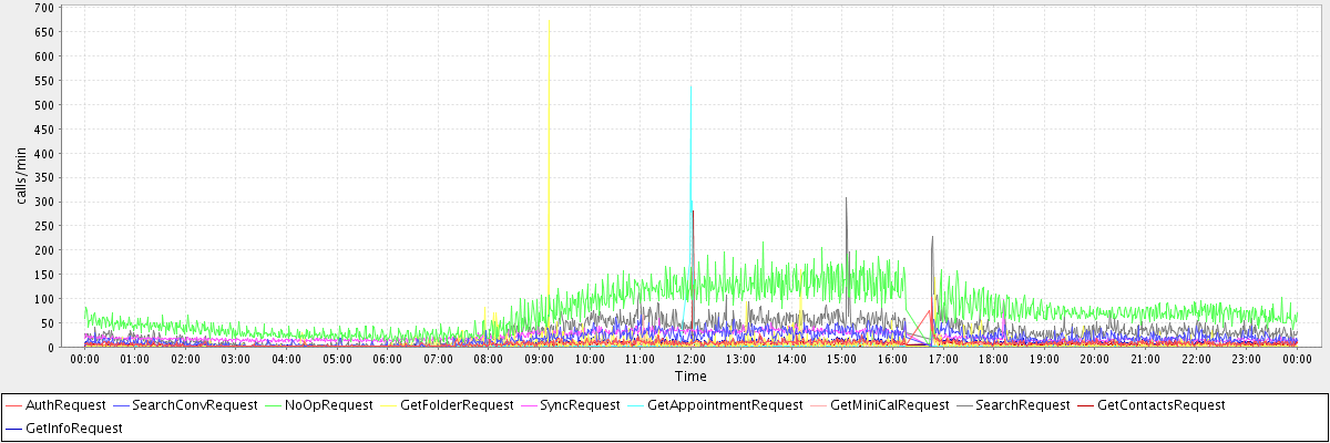 max(AuthRequest) = 103.00 max(SearchConvRequest) = 65.00 max(NoOpRequest) = 216.00 max(GetFolderRequest) = 673.00 max(SyncRequest) = 98.00 max(GetAppointmentRequest) = 537.00 max(GetMiniCalRequest) = 65.00 max(SearchRequest) = 308.00 max(GetContactsRequest) = 280.00 max(GetInfoRequest) = 114.00