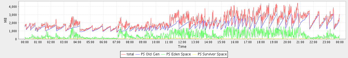 avg(total) = 2103.69 avg(PS Old Gen) = 1647.64 avg(PS Eden Space) = 433.19 avg(PS Survivor Space) = 22.86