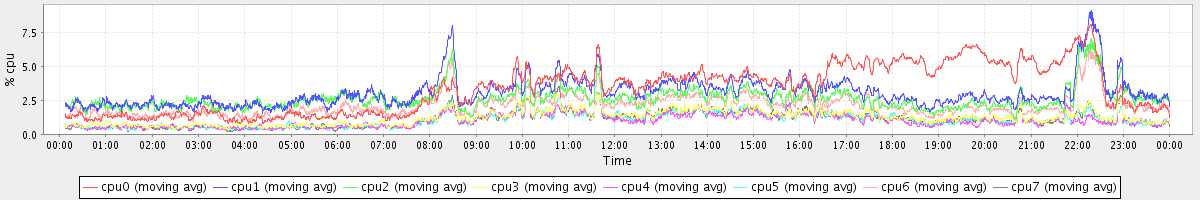 avg(cpu0) = 23.44 avg(cpu1) = 8.63 avg(cpu2) = 7.57 avg(cpu3) = 6.49 avg(cpu4) = 5.22 avg(cpu5) = 5.91 avg(cpu6) = 7.67 avg(cpu7) = 6.72