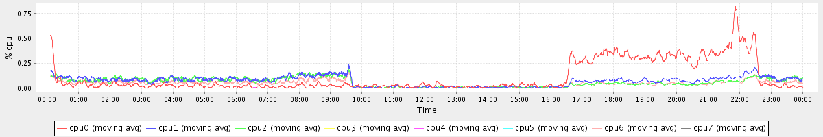 avg(cpu0) = 1.14 avg(cpu1) = 0.23 avg(cpu2) = 0.21 avg(cpu3) = 0.10 avg(cpu4) = 0.07 avg(cpu5) = 0.08 avg(cpu6) = 0.16 avg(cpu7) = 0.08
