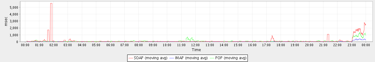 avg(MaintainTablesRequest) = 272718.00 avg(GetQuotaUsageRequest) = 2764.00 avg(MsgActionRequest.update) = 1176.24 avg(AddMsgRequest) = 2922.09 avg(ConvActionRequest.trash) = 424.41 avg(SendMsgRequest) = 639.71 avg(SetAppointmentRequest) = 444.00 avg(BackupRequest) = 360804.50 avg(FolderActionRequest.empty) = 3904.52 avg(SaveDraftRequest) = 611.26