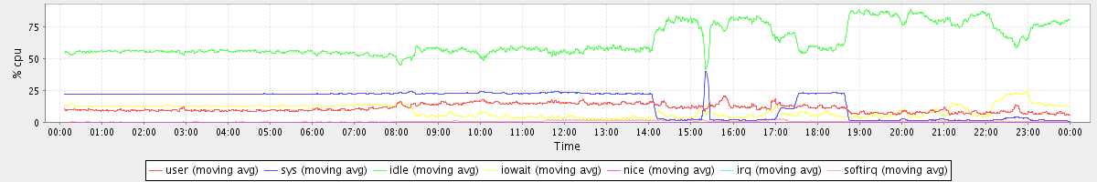 avg(user) = 11.12 avg(sys) = 15.31 avg(idle) = 63.82 avg(iowait) = 8.98 avg(nice) = 0.00 avg(irq) = 0.05 avg(softirq) = 0.72