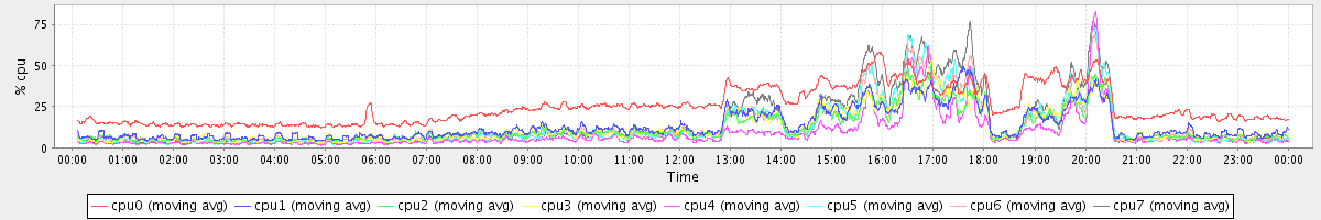 avg(cpu0) = 25.08 avg(cpu1) = 13.37 avg(cpu2) = 11.91 avg(cpu3) = 12.18 avg(cpu4) = 8.71 avg(cpu5) = 12.52 avg(cpu6) = 13.01 avg(cpu7) = 14.45