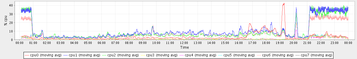 avg(cpu0) = 20.24 avg(cpu1) = 7.00 avg(cpu2) = 6.82 avg(cpu3) = 5.96 avg(cpu4) = 3.79 avg(cpu5) = 5.52 avg(cpu6) = 5.77 avg(cpu7) = 5.92