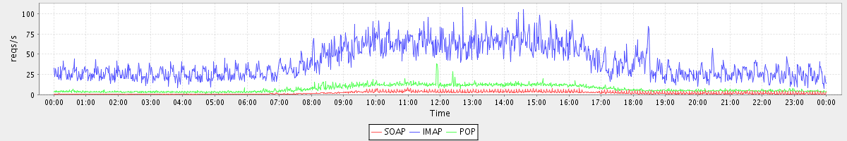 Host zm04.stanford.edu: Mailboxd: Request Rate by Client Protocol
