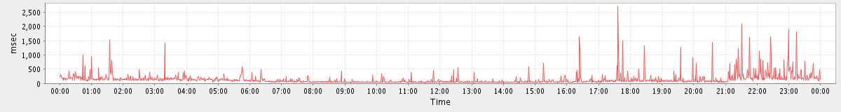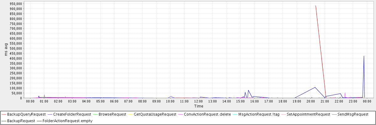 avg(BackupQueryRequest) = 745.40 avg(CreateFolderRequest) = 526.50 avg(BrowseRequest) = 568.00 avg(GetQuotaUsageRequest) = 2836.00 avg(ConvActionRequest.delete) = 1194.56 avg(MsgActionRequest.!tag) = 934.00 avg(SetAppointmentRequest) = 351.67 avg(SendMsgRequest) = 398.37 avg(BackupRequest) = 464218.50 avg(FolderActionRequest.empty) = 19489.93