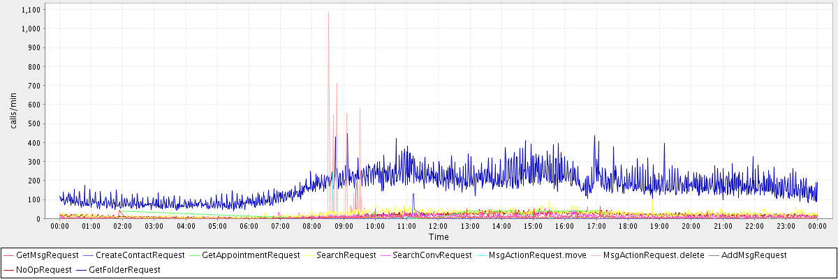 max(GetMsgRequest) = 64.00 max(CreateContactRequest) = 130.00 max(GetAppointmentRequest) = 41.00 max(SearchRequest) = 97.00 max(SearchConvRequest) = 63.00 max(MsgActionRequest.move) = 241.00 max(MsgActionRequest.delete) = 1081.00 max(AddMsgRequest) = 200.00 max(NoOpRequest) = 52.00 max(GetFolderRequest) = 446.00