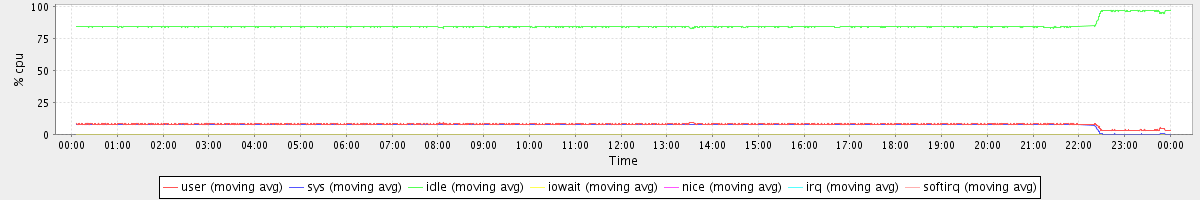avg(user) = 7.78 avg(sys) = 7.08 avg(idle) = 85.08 avg(iowait) = 0.04 avg(nice) = 0.00 avg(irq) = 0.00 avg(softirq) = 0.00