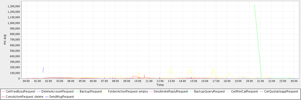 avg(GetFreeBusyRequest) = 5527.40 avg(DeleteAccountRequest) = 152810.50 avg(BackupRequest) = 667907.50 avg(FolderActionRequest.empty) = 20663.57 avg(SendInviteReplyRequest) = 376.92 avg(BackupQueryRequest) = 1002.38 avg(GetMiniCalRequest) = 987.05 avg(GetQuotaUsageRequest) = 2825.00 avg(ConvActionRequest.delete) = 1181.64 avg(SendMsgRequest) = 437.81