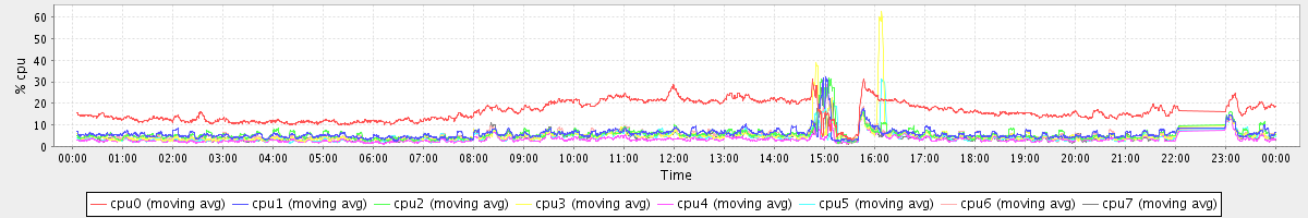 avg(cpu0) = 16.25 avg(cpu1) = 5.96 avg(cpu2) = 5.72 avg(cpu3) = 5.13 avg(cpu4) = 3.32 avg(cpu5) = 4.40 avg(cpu6) = 5.18 avg(cpu7) = 4.36