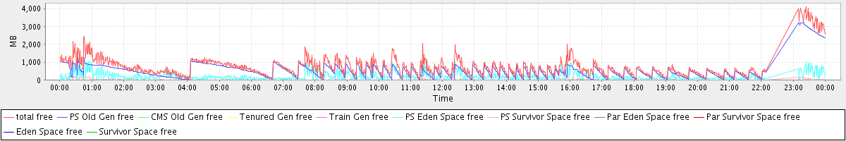 avg(total free) = 754.21 avg(PS Old Gen free) = 533.65 avg(CMS Old Gen free) = 0.00 avg(Tenured Gen free) = 0.00 avg(Train Gen free) = 0.00 avg(PS Eden Space free) = 207.73 avg(PS Survivor Space free) = 12.83 avg(Par Eden Space free) = 0.00 avg(Par Survivor Space free) = 0.00 avg(Eden Space free) = 0.00 avg(Survivor Space free) = 0.00