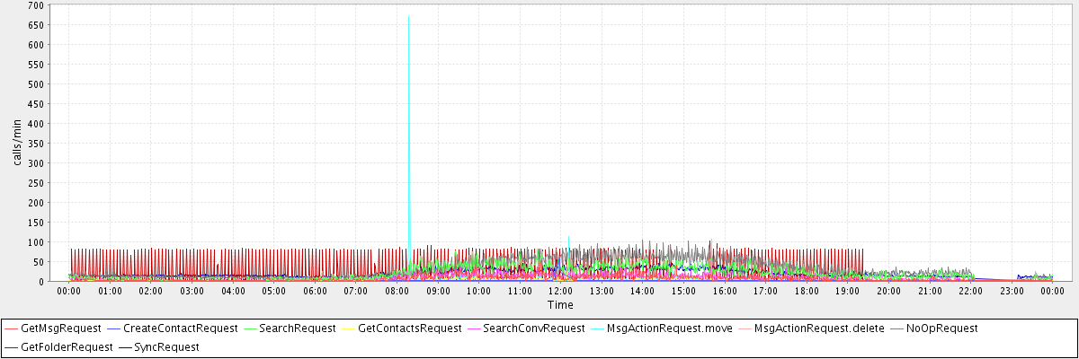 max(GetMsgRequest) = 52.00 max(CreateContactRequest) = 58.00 max(SearchRequest) = 81.00 max(GetContactsRequest) = 41.00 max(SearchConvRequest) = 44.00 max(MsgActionRequest.move) = 671.00 max(MsgActionRequest.delete) = 107.00 max(NoOpRequest) = 104.00 max(GetFolderRequest) = 102.00 max(SyncRequest) = 54.00