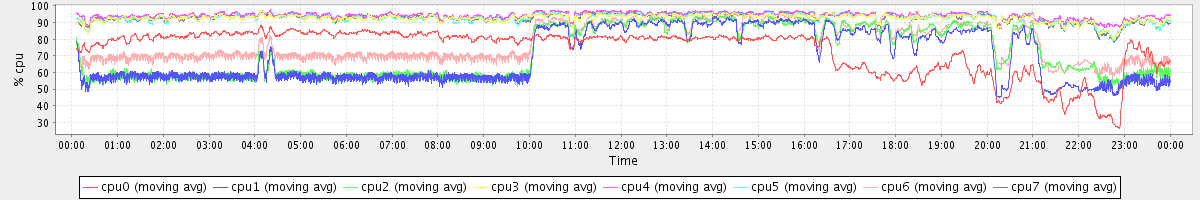 avg(cpu0) = 73.76 avg(cpu1) = 69.59 avg(cpu2) = 71.92 avg(cpu3) = 92.69 avg(cpu4) = 94.38 avg(cpu5) = 93.03 avg(cpu6) = 77.84 avg(cpu7) = 92.90