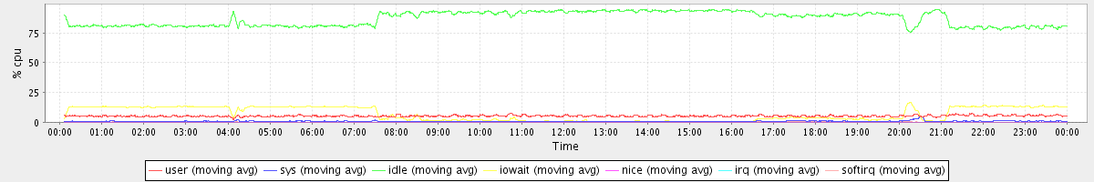 avg(user) = 5.26 avg(sys) = 0.79 avg(idle) = 87.02 avg(iowait) = 6.74 avg(nice) = 0.00 avg(irq) = 0.01 avg(softirq) = 0.16