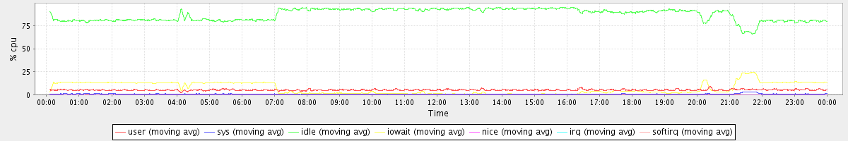 avg(user) = 5.15 avg(sys) = 0.76 avg(idle) = 87.10 avg(iowait) = 6.81 avg(nice) = 0.00 avg(irq) = 0.02 avg(softirq) = 0.16