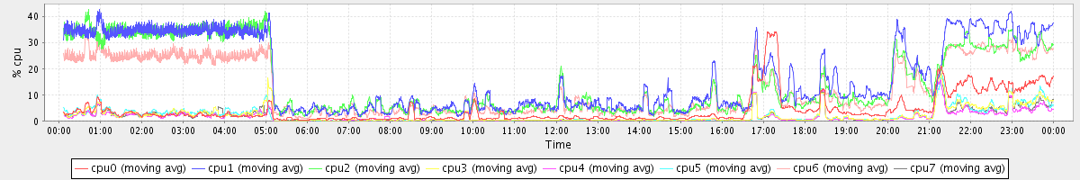 avg(cpu0) = 17.49 avg(cpu1) = 7.81 avg(cpu2) = 6.60 avg(cpu3) = 6.45 avg(cpu4) = 4.40 avg(cpu5) = 5.37 avg(cpu6) = 6.49 avg(cpu7) = 5.61