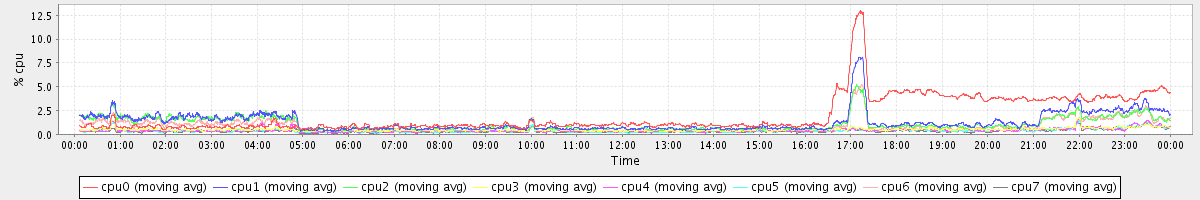 avg(cpu0) = 1.18 avg(cpu1) = 0.13 avg(cpu2) = 0.11 avg(cpu3) = 0.04 avg(cpu4) = 0.05 avg(cpu5) = 0.04 avg(cpu6) = 0.09 avg(cpu7) = 0.04