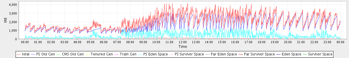 avg(total) = 2089.48 avg(PS Old Gen) = 1636.25 avg(CMS Old Gen) = 0.00 avg(Tenured Gen) = 0.00 avg(Train Gen) = 0.00 avg(PS Eden Space) = 403.32 avg(PS Survivor Space) = 49.92 avg(Par Eden Space) = 0.00 avg(Par Survivor Space) = 0.00 avg(Eden Space) = 0.00 avg(Survivor Space) = 0.00